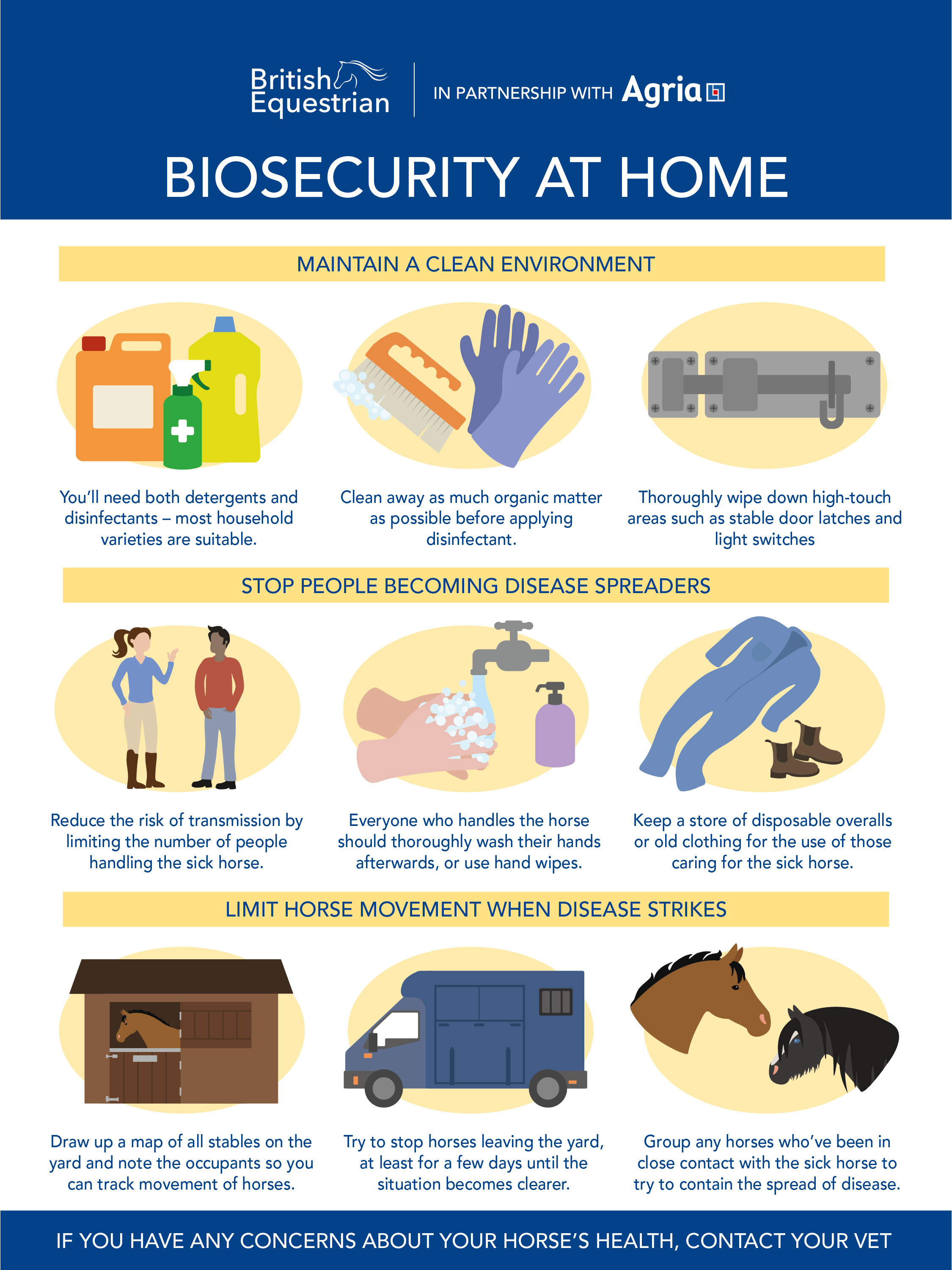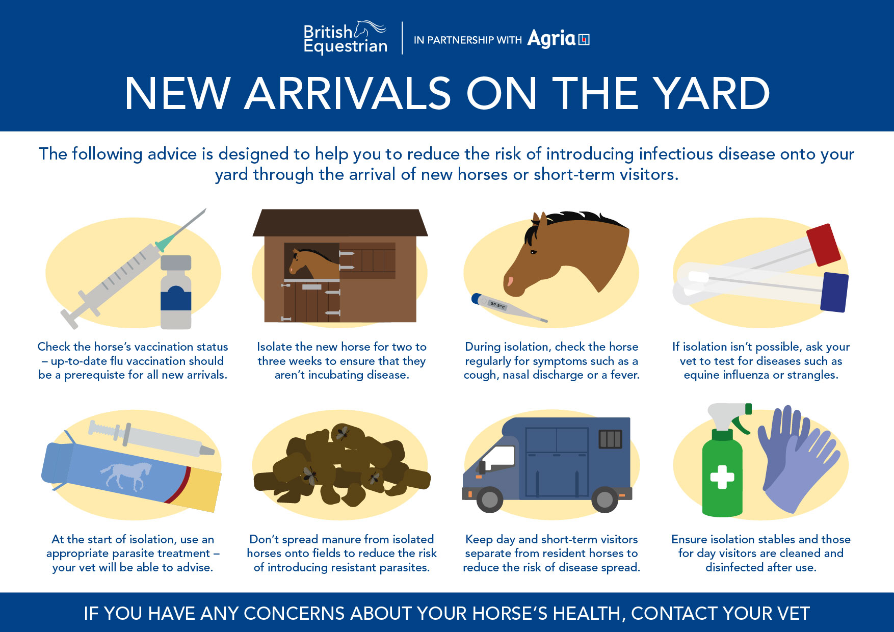 World Horse Welfare has a fantastic template to help you create a bespoke annual health plan for your horse. It covers all aspects of routine health care, including signs of health, vaccination appointments, weight monitoring, parasite control and practitioner visits. Access it here.